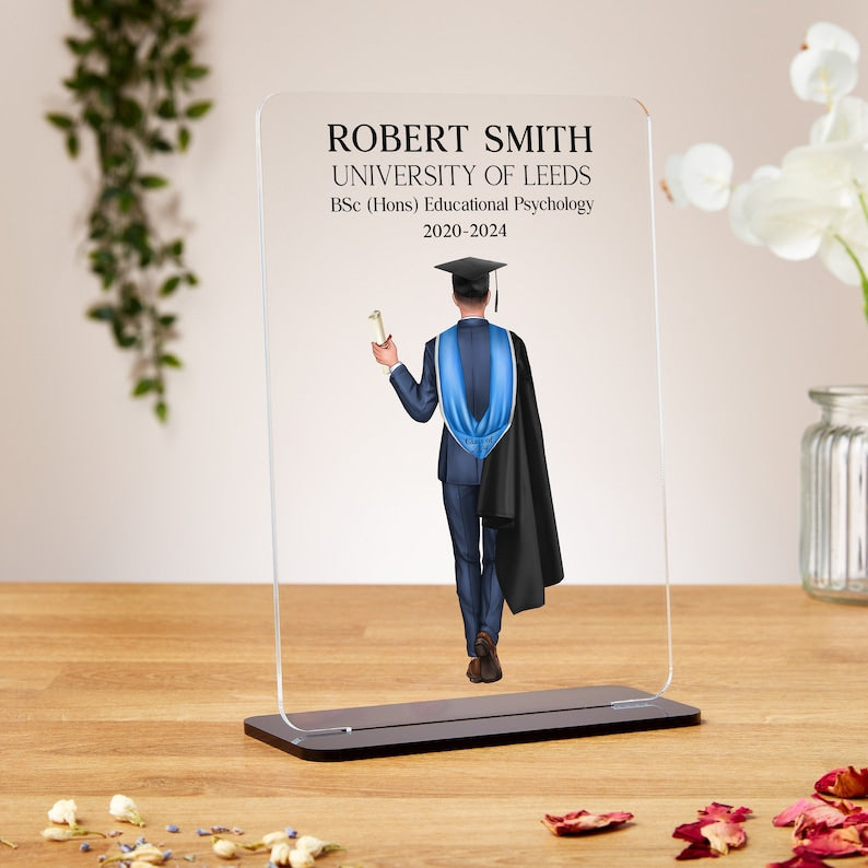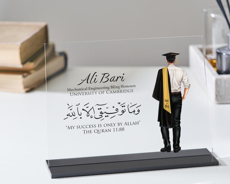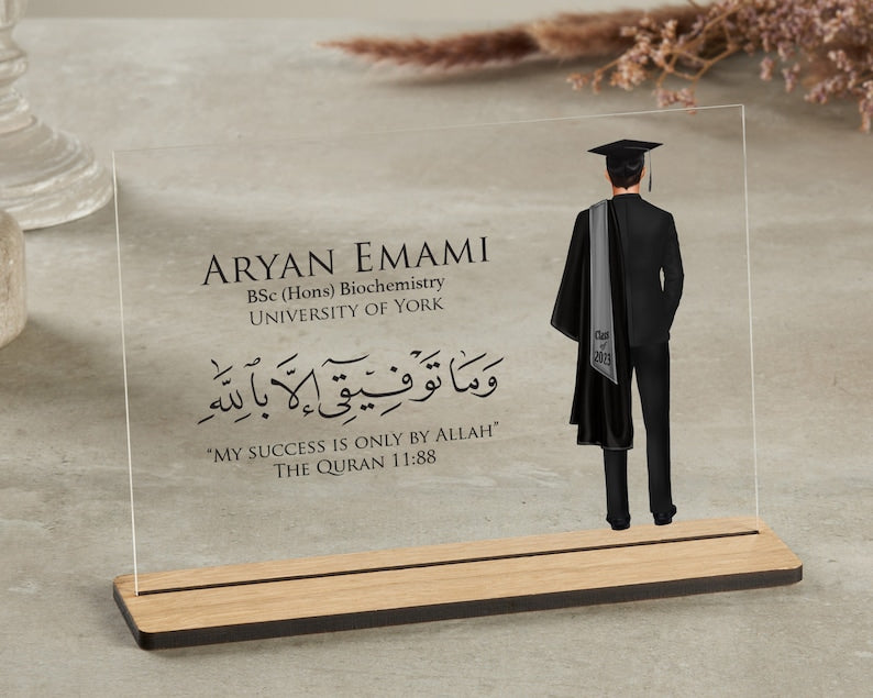 Honor the academic achievements of your loved ones with our premium Acrylic Graduation Plaque. Crafted from high-quality acrylic plexiglass, this elegant plaque offers a crystal-clear finish and comes with a sturdy base, ensuring durability and a sleek display. Personalize it with the graduate's name, graduation year, and a heartfelt message to create a unique keepsake that captures this significant milestone beautifully.