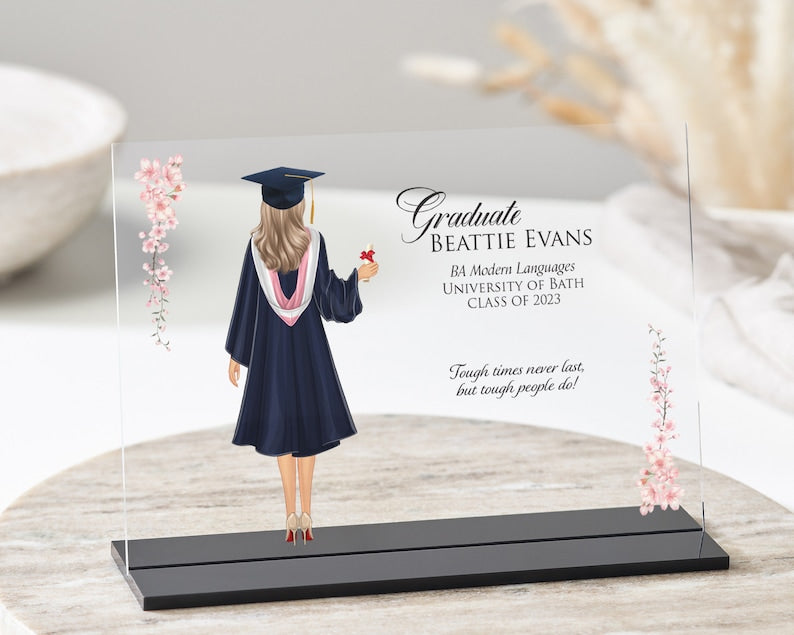 Honor the academic achievements of your loved ones with our premium Acrylic Graduation Plaque. Crafted from high-quality acrylic plexiglass, this elegant plaque offers a crystal-clear finish and comes with a sturdy base, ensuring durability and a sleek display. Personalize it with the graduate's name, graduation year, and a heartfelt message to create a unique keepsake that captures this significant milestone beautifully.