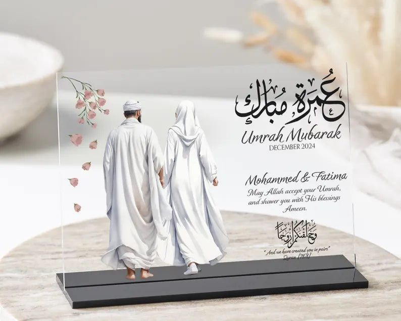 Our Umrah Mubarak acrylic plaques are simply stunning, a reminder of the important day in the couple's life. This particular plaque comes in the shape of a heart with beautiful lavender flowers around the plaque.